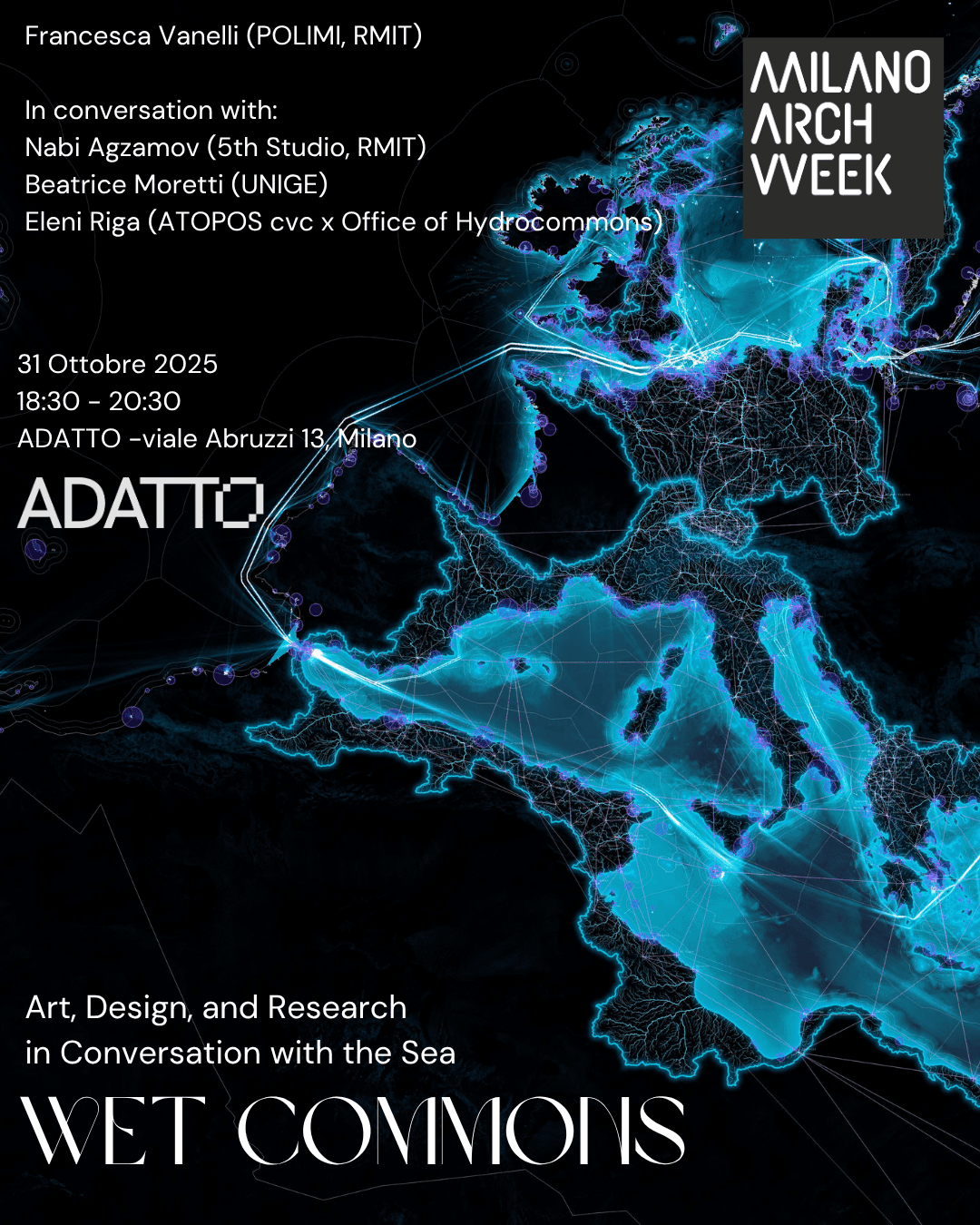 31 October 2025, 18:30–20:30 Hosted by Adatto Space, Viale Abruzzi 13, Milan As part of Milan Arch Week, promoted by Triennale Milano, Politecnico di Milano, and the Municipality of Milan, the talk “Wet Commons: Art, Design, and Research in Conversation with the Sea” brings together artists, designers, and researchers to reflect on the relationship between water and our shared environments. Across the Mediterranean and the North Sea, the discussion takes as its starting point three publications — Landscape of the Clusters, Office of the Hydrocommons, and North Sea Rising — to explore how water shapes and unsettles our territories. The event will offer a multidisciplinary exchange on adaptation, fragility, and cooperation. The talk is led by Francesca Vanelli, Marie Curie Dual PhD Candidate at the Department of Architecture, Built Environment and Construction Engineering of Politecnico di Milano and RMIT University, under the REDI Program. The event will be held in English and followed by an informal networking gathering.
